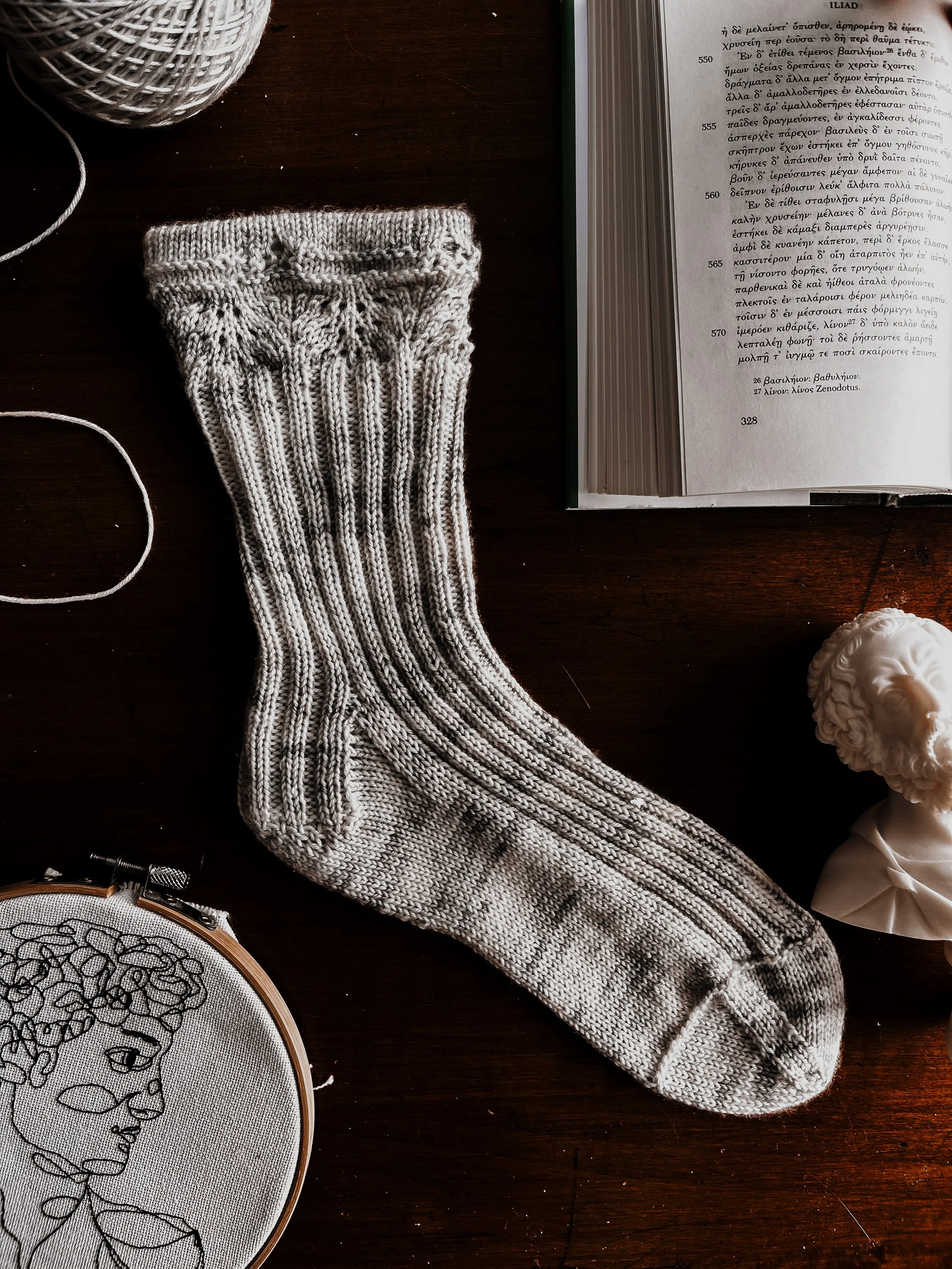 the achilles socks are inspired by achilles from the iliad, madeline miller’s song of achilles, and Coley from pasley Knits’s stunning song of achilles colourway! this is a pattern for fingering-weight mid-calf socks with beautiful lace and cable features. there are a few intermediate techniques, including kitchener stitch and lace and cable charts.