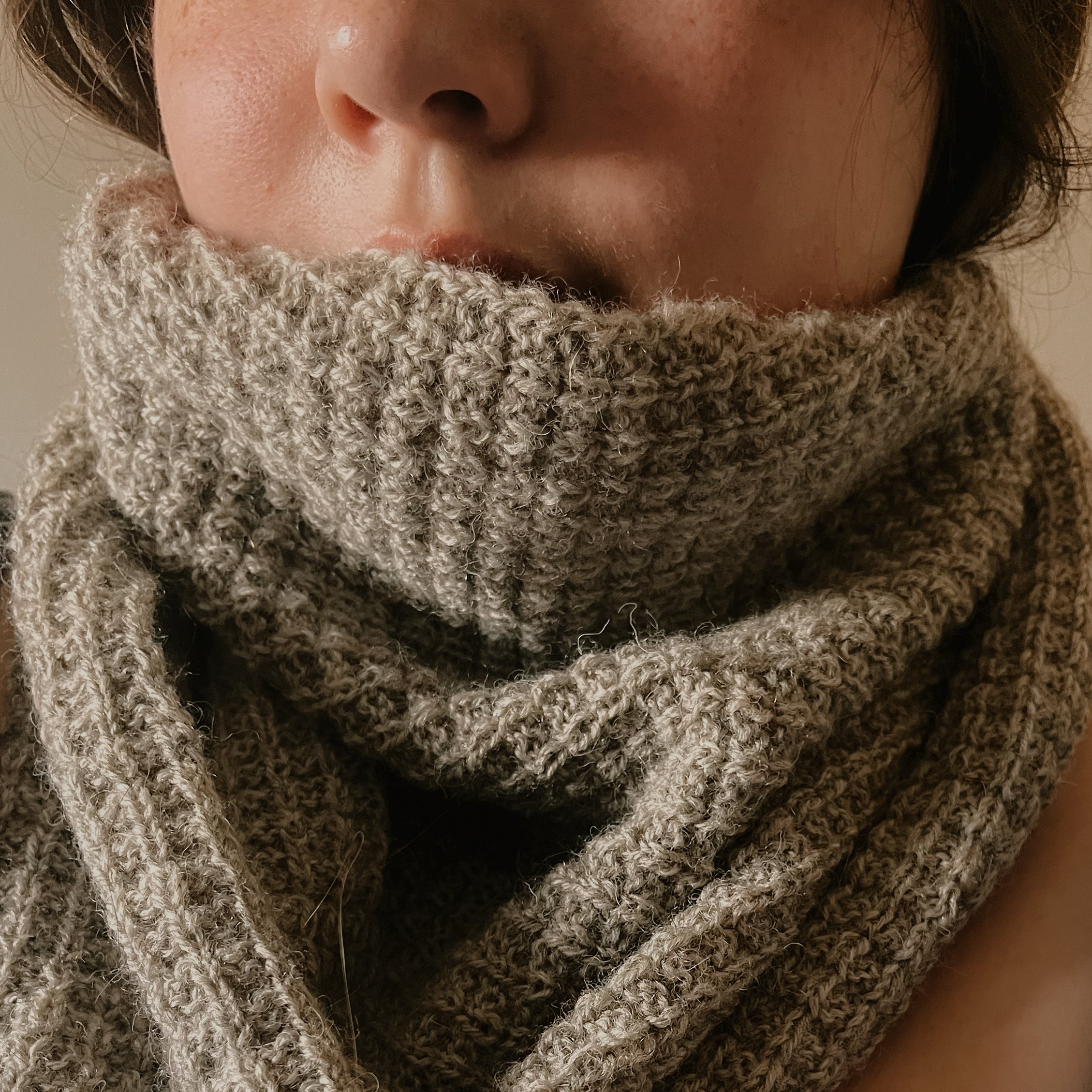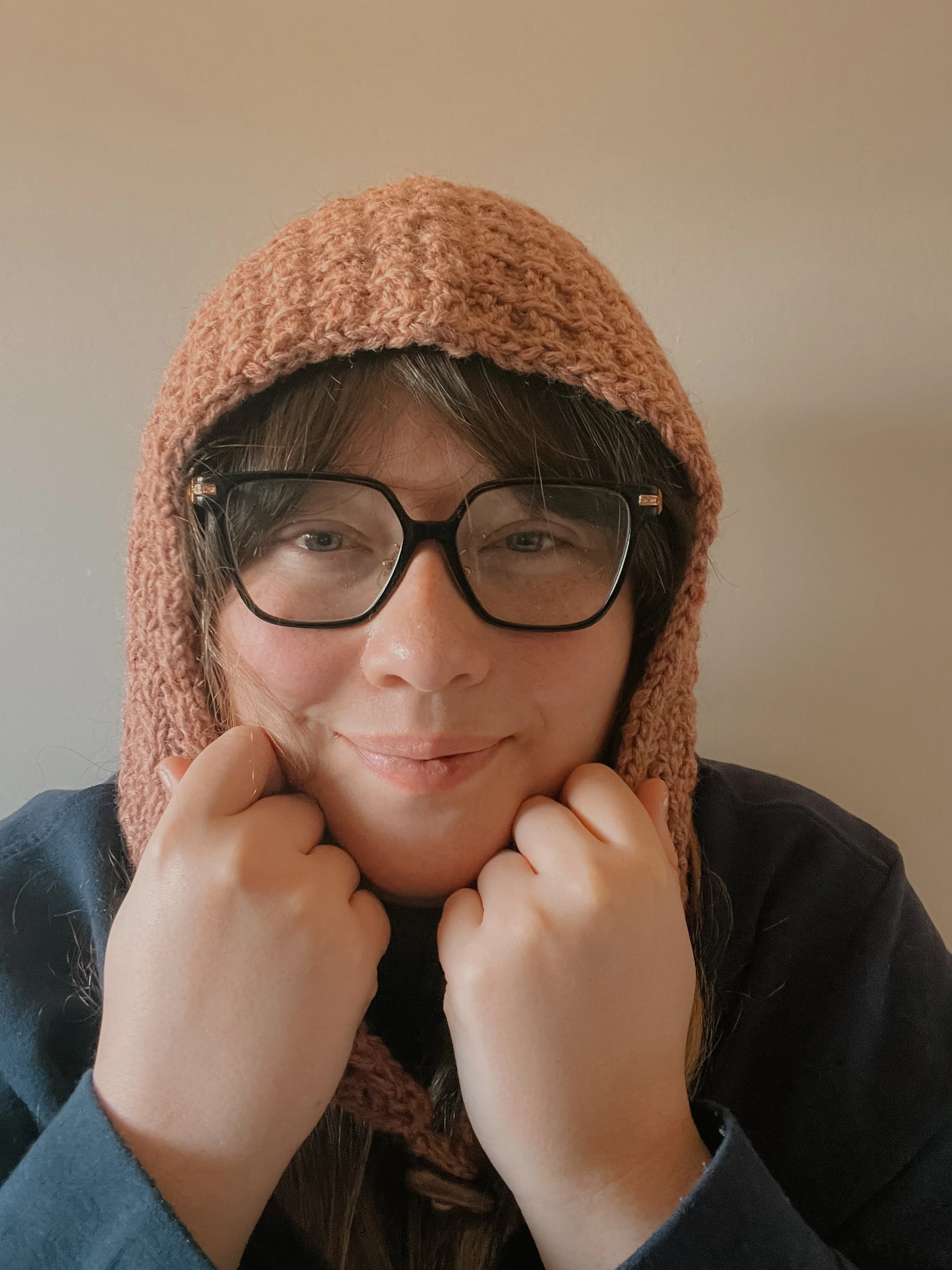this hood is designed to use about one skein of fingering-weight yarn held triple or about 100g of aran weight yarn. it is written for two different heights depending on how long you want your hood to be.