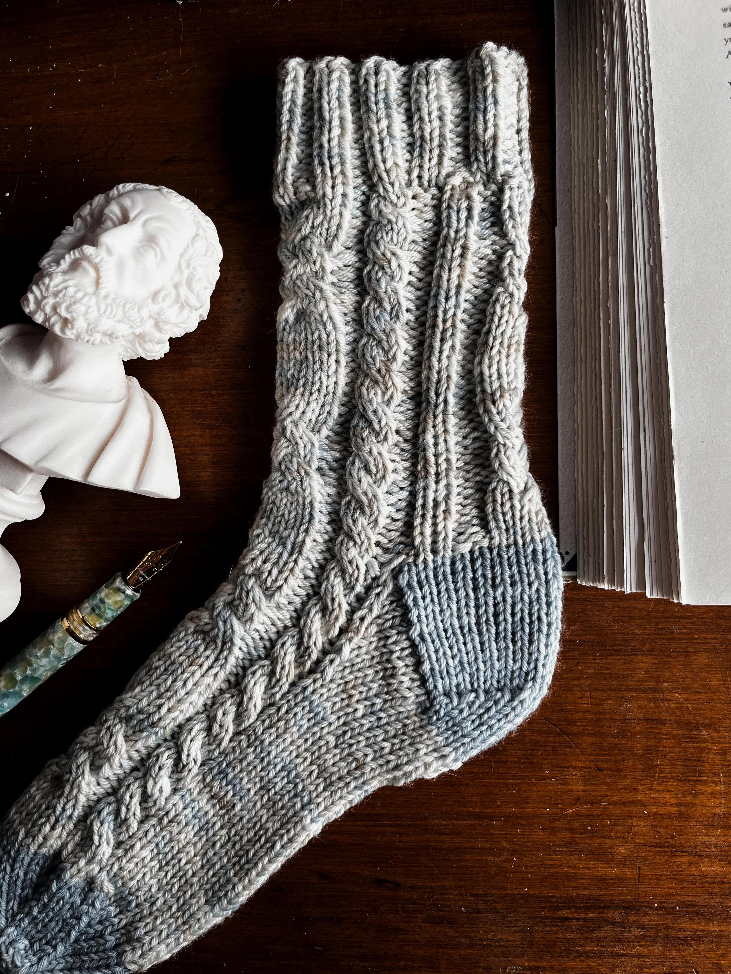 the patroclus socks are inspired by patroclus from the iliad, madeline miller’s song of achilles, and Coley from pasley knits stunning song of achilles colourway! this is a pattern for dk-weight mid-calf socks with beautiful cable features. there are a few intermediate techniques, including kitchener stitch and cable charts.