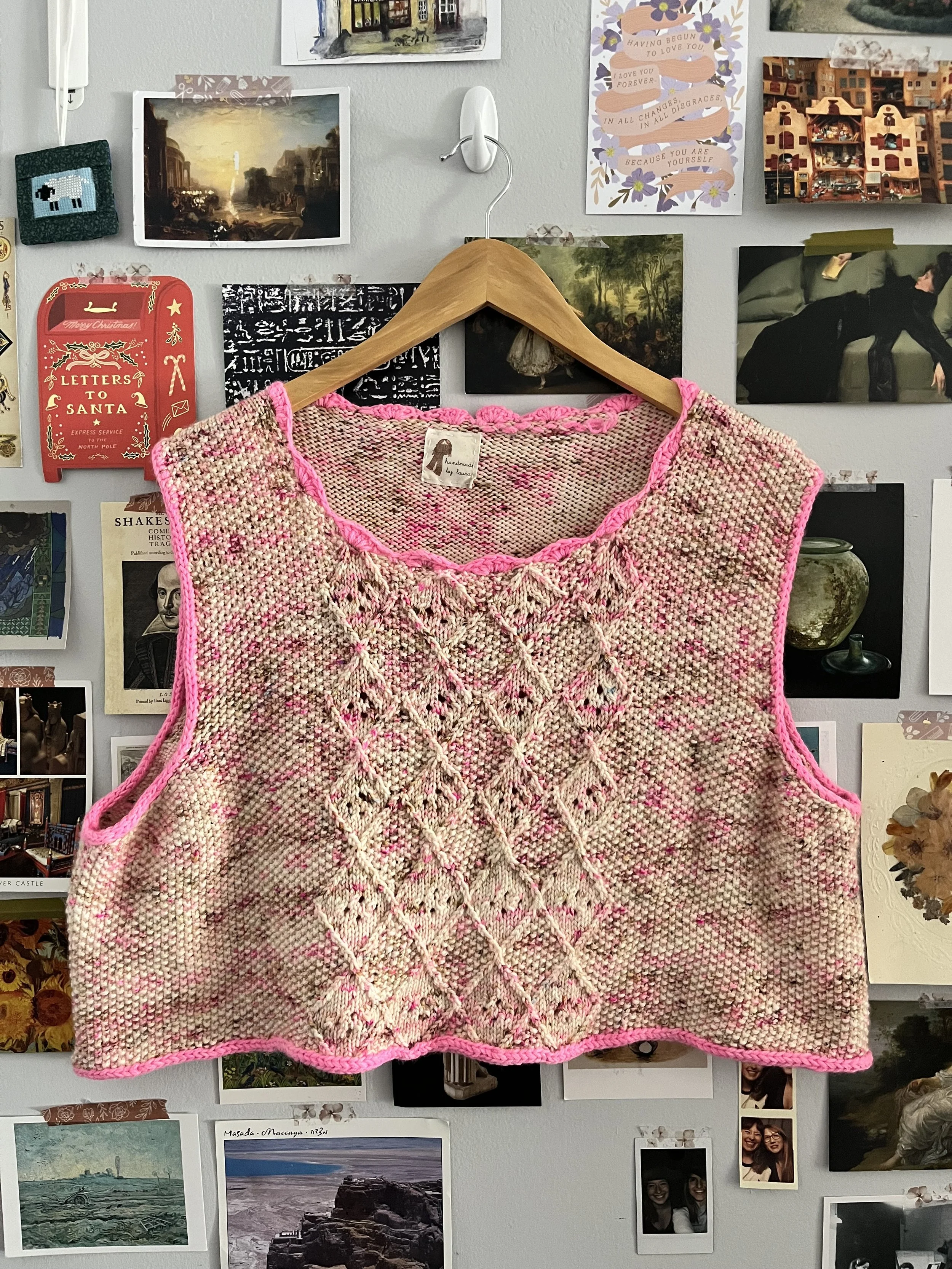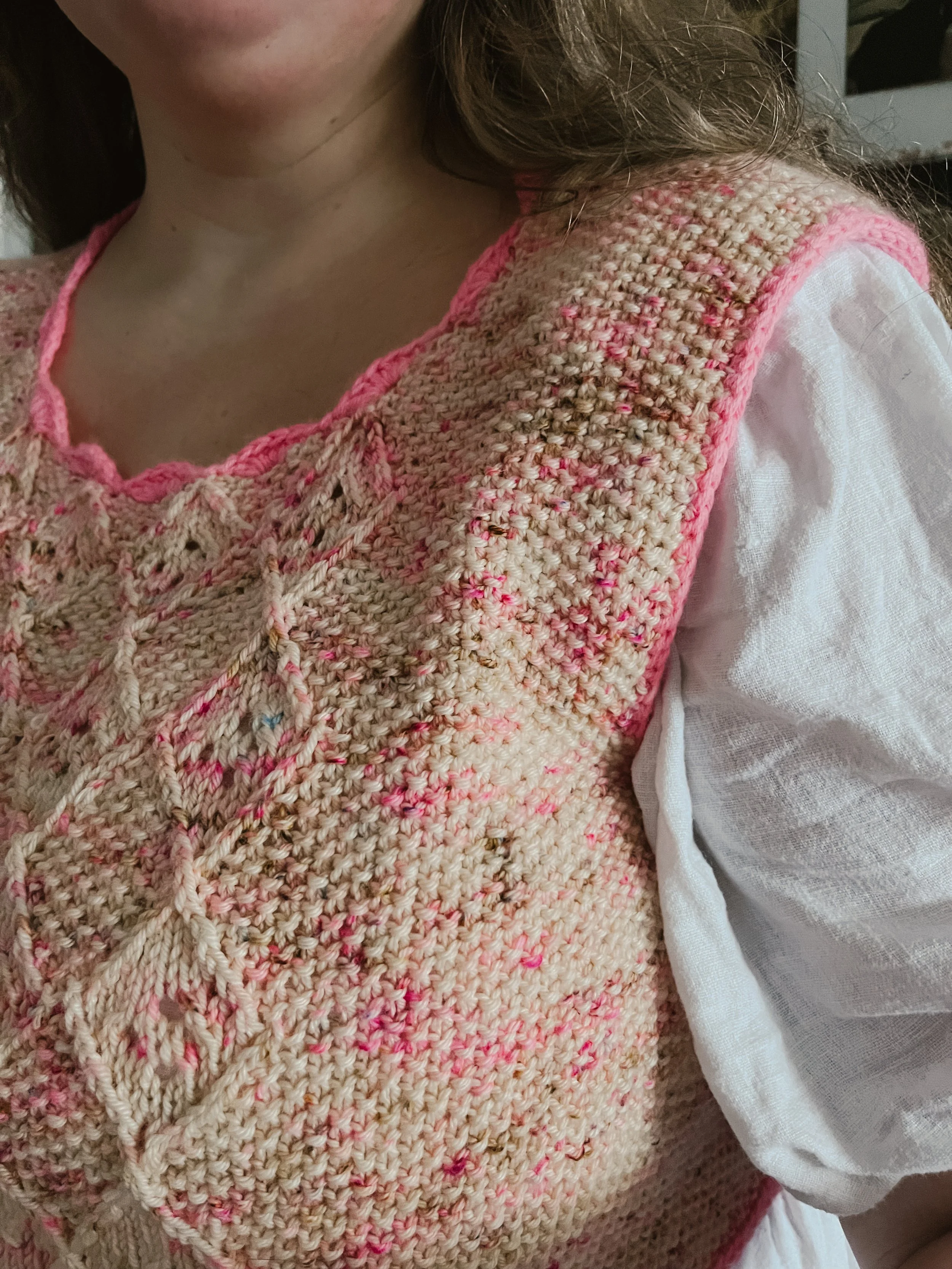 this pattern is for a dk-weight slipover designed for about 5cm/2in of positive ease and cropped to fit perfectly over a dress or high-waisted pants! this pattern features cables, moss stitch, eyelets, an i-cord edge, and an optional delicate crochet frill around the neck. the back of the garment is stockinette and features german short rows to raise the back slightly. it is knitted top down, first flat for the front, shoulders, and back, and then joined under the arms and knit in the round until the end.