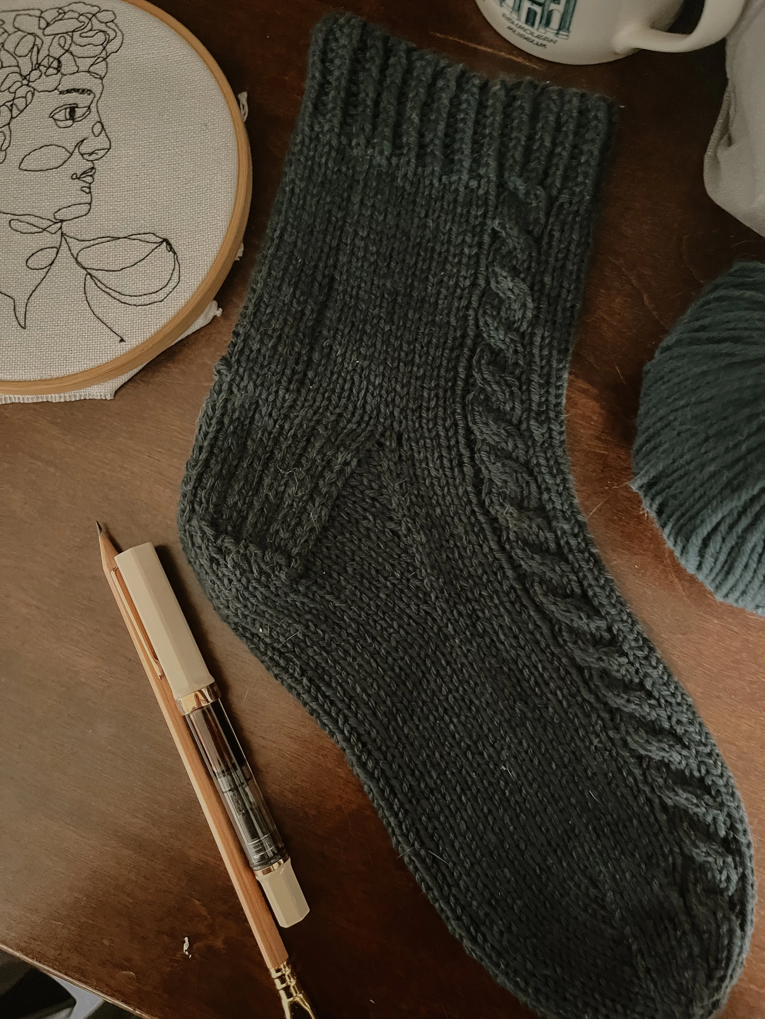 the beautiful cables on this sock are echoed in its sister sock, the achilles sock because achilles and patroclus are always part of each other’s lives. their love echoes through the generations and i wanted to commemorate that in these two pairs of socks ❤️